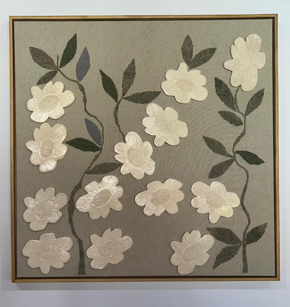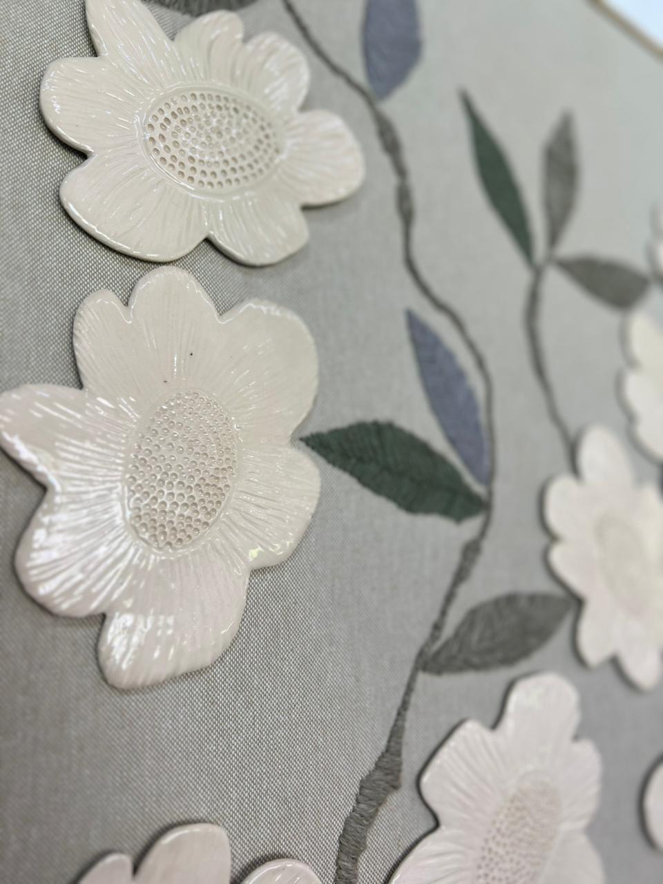 Técnica:Cerámica y bordado, sobre soporte de telas naturales
